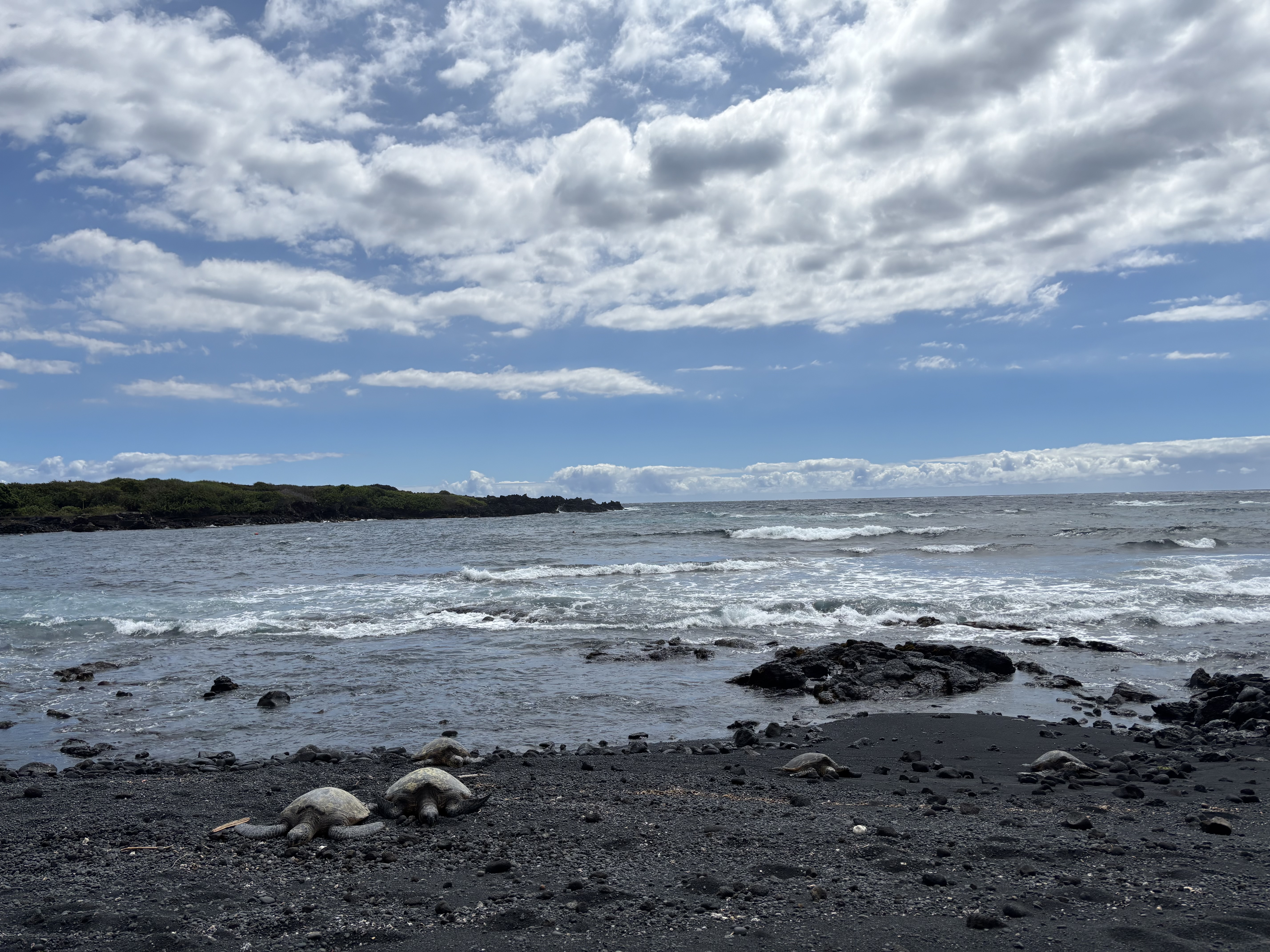 ハワイ島の東部にある黒砂海岸。運が良ければ、ビーチで日光浴をする『ホヌ」(アオウミガメ)を見ることができるかもしれません。